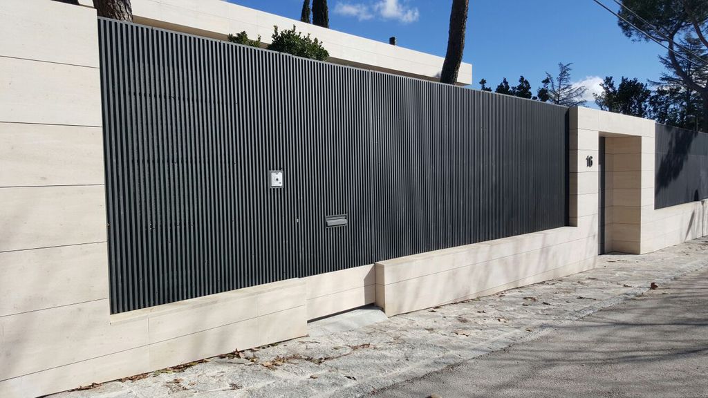 Puerta seccional del garaje, motorizada, mismo material y color que resto de cerramientos.